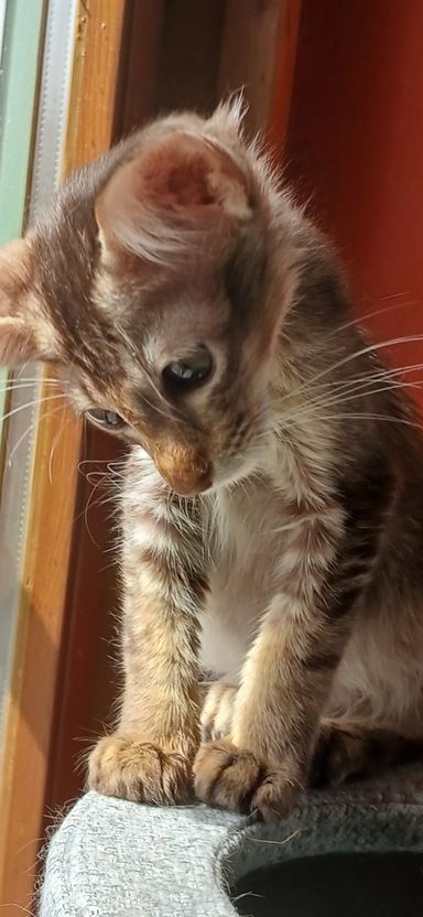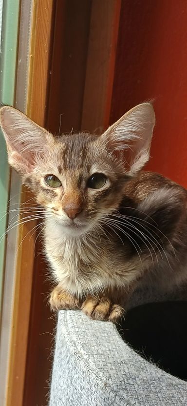 Hieraus stehen zwei Mädchen in der Farbe chocolate silver tabby ticked zum Verkauf. Sie werden später so aussehen wie die Mama. Schokoladen Kitten mit gestreiften Beinen und einem hellen Bauch. Bei "tabby" sieht man immer ein "M" auf der Stirn. "Ticked" heisst, dass die dunkelbraunen Haare mit einer helleren Farbe gebändert sind.